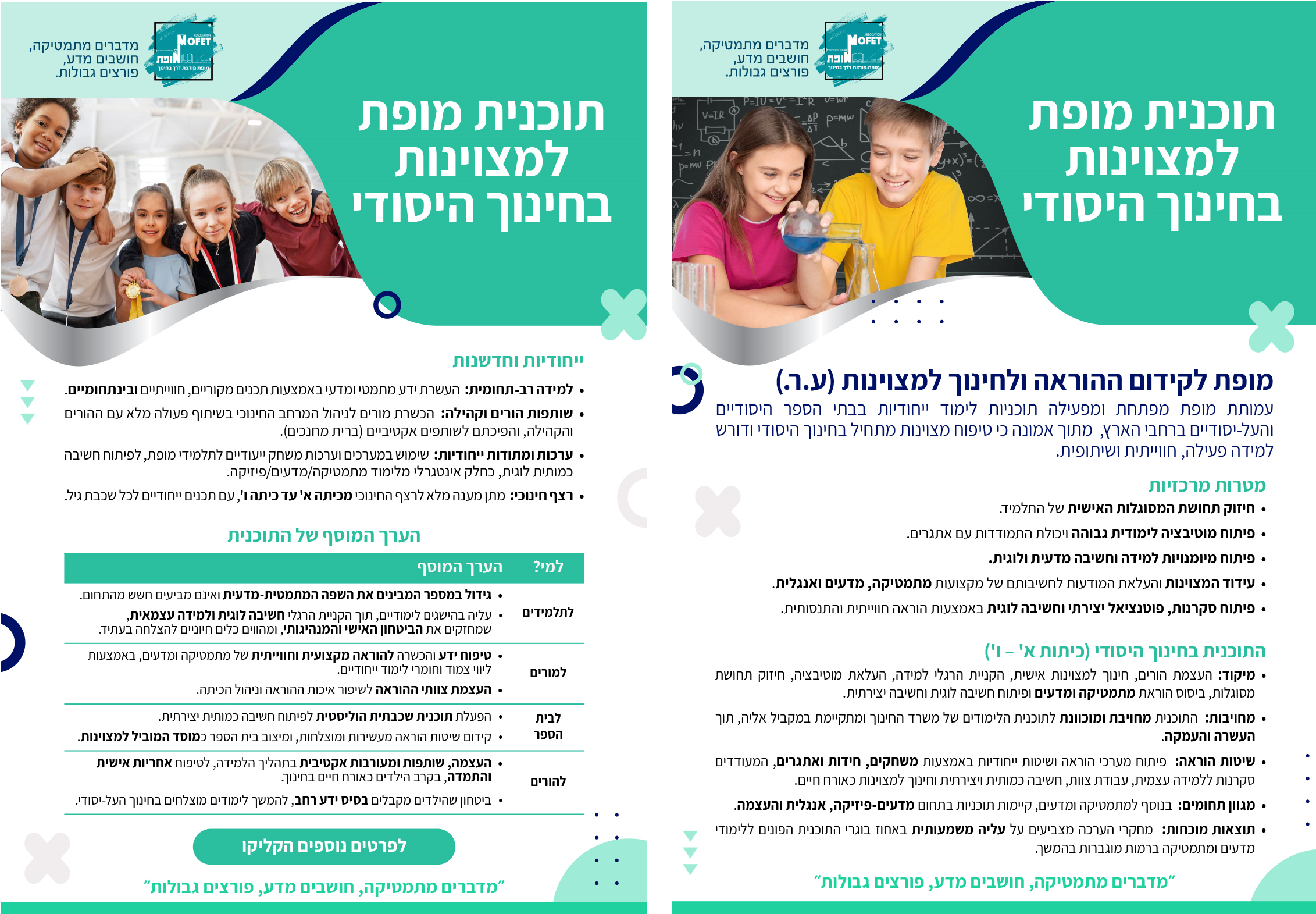עמותת מופת לקידום ההוראה ולחינוך למצוינות (ע.ר.), מפתחת ומפעילה תוכניות לימוד ייחודיות בבתי הספר היסודיים והעל יסודיים ברחבי הארץ.