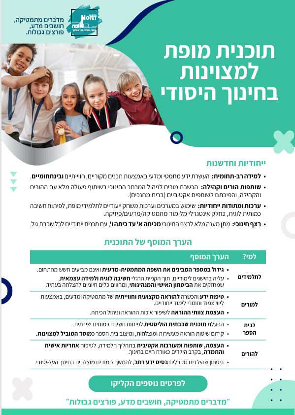 תכנית מופת בחינוך היסודי מופעלת בכתות א' – ו' ומתמקדת בהעצמת הורי התלמידים, חינוך למצוינות אישית כאורח חיים, הקניית הרגלי למידה, העלאת המוטיבציה הלימודית וחיזוק תחושת המסוגלות, ביסוס הוראת המתמטיקה והמדעים ופיתוח חשיבה מתמטית ויצירתיות בפתרון בעיות.